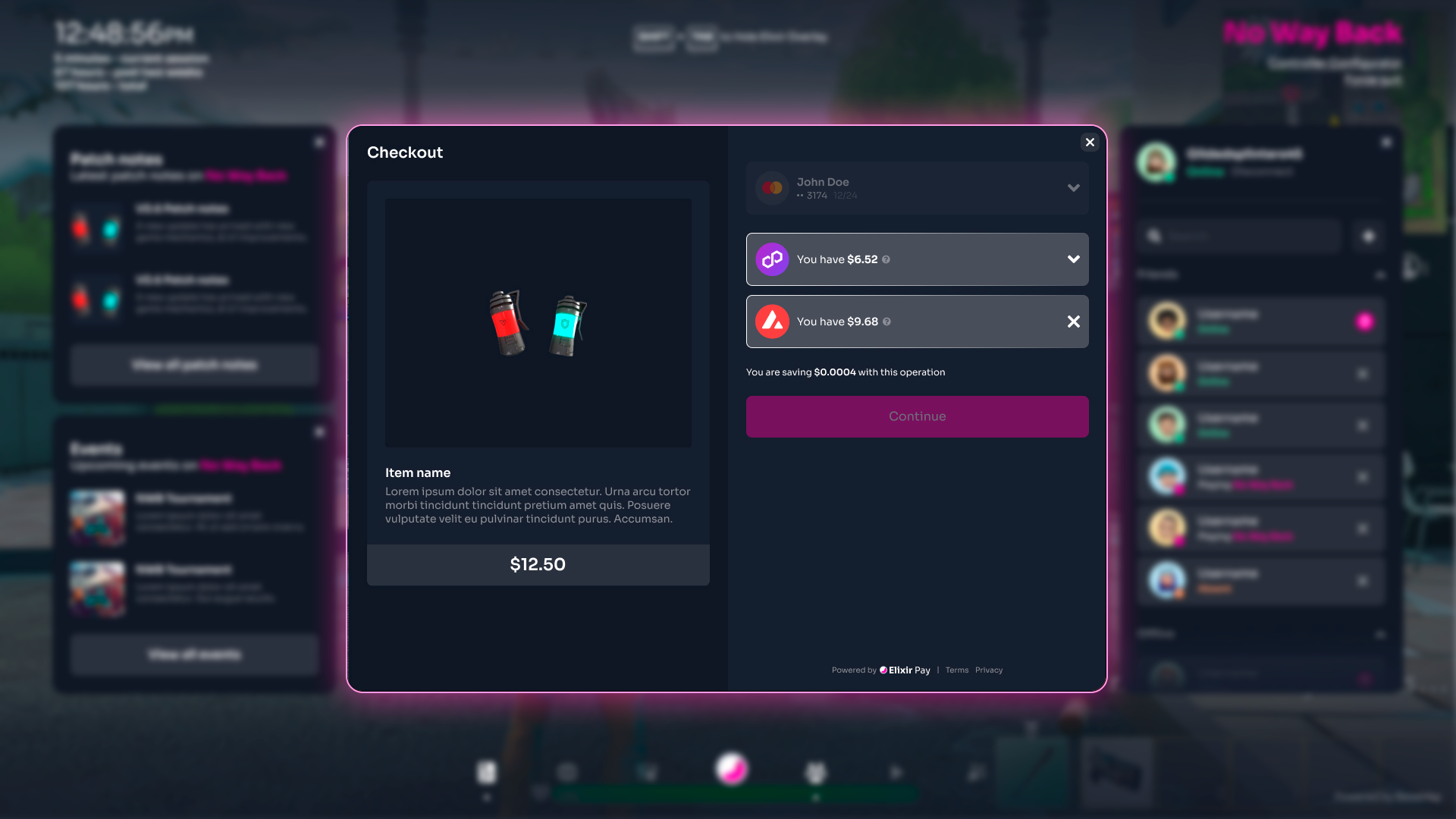 For us, user security is the cornerstone of our ecosystem and our top priority. That's why we've developed an in-app purchase system that enables users to make purchases seamlessly, using either a credit card or one of their favorite payment methods, without the need to be redirected to third-party sites or risk entering their information on untrustworthy websites. With Elixir's in-app purchases (IAPs), players can make their purchases directly within the overlay, allowing them to stay engaged and enjoy their purchases instantly.